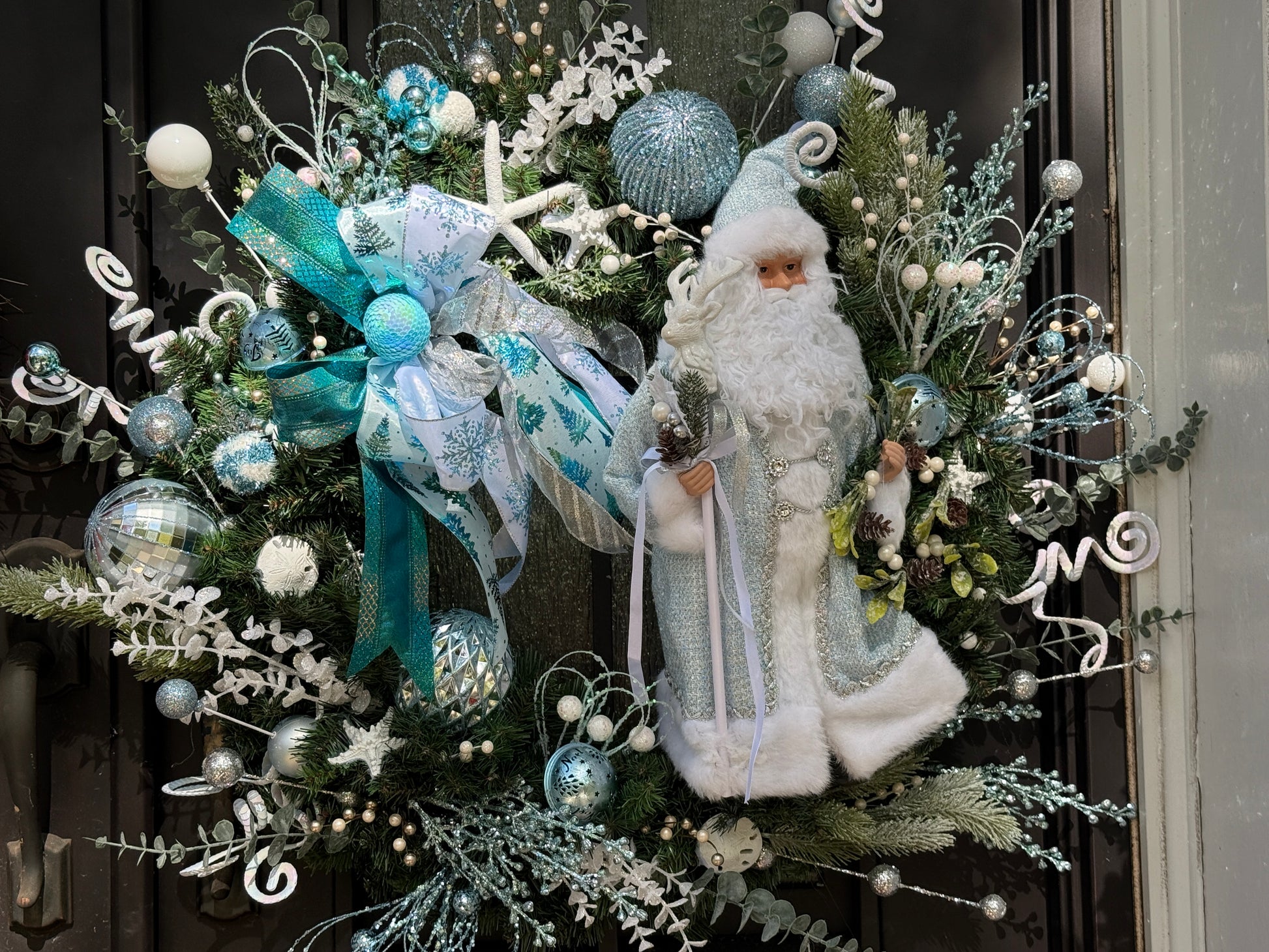 Bring the beauty of the sea to your holiday home. This one-of-a-kind 30” Christmas wreath blends coastal serenity with classic holiday magic. Handcrafted with shimmering aqua ornaments, frosted greenery, and a charming Santa centerpiece dressed in icy blue and white, it’s a show-stopping design that captures the wonder of a “Coastal Christmas.”