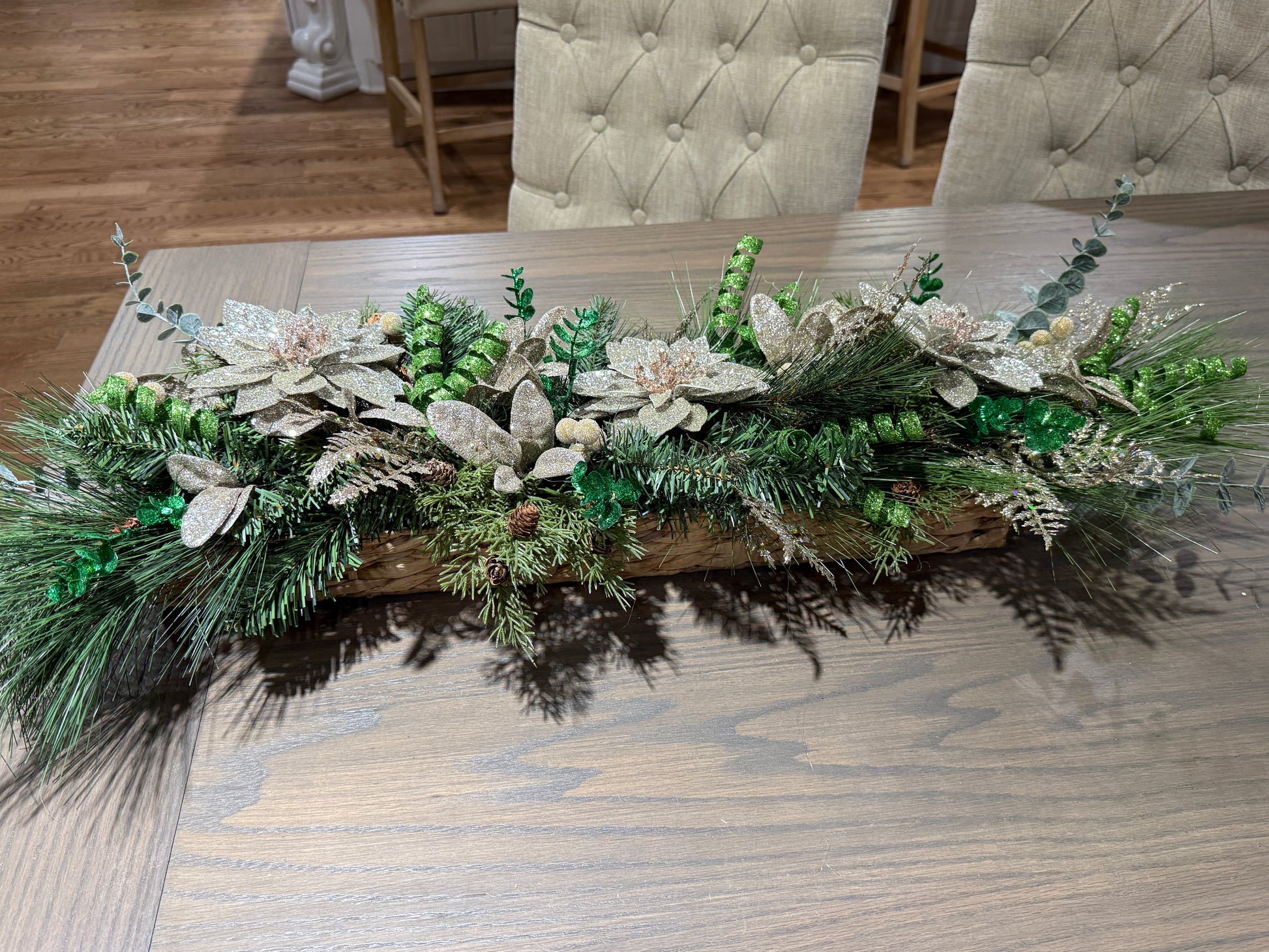 Features gold glitter poinsettias, frosted pine, and assorted greenery
