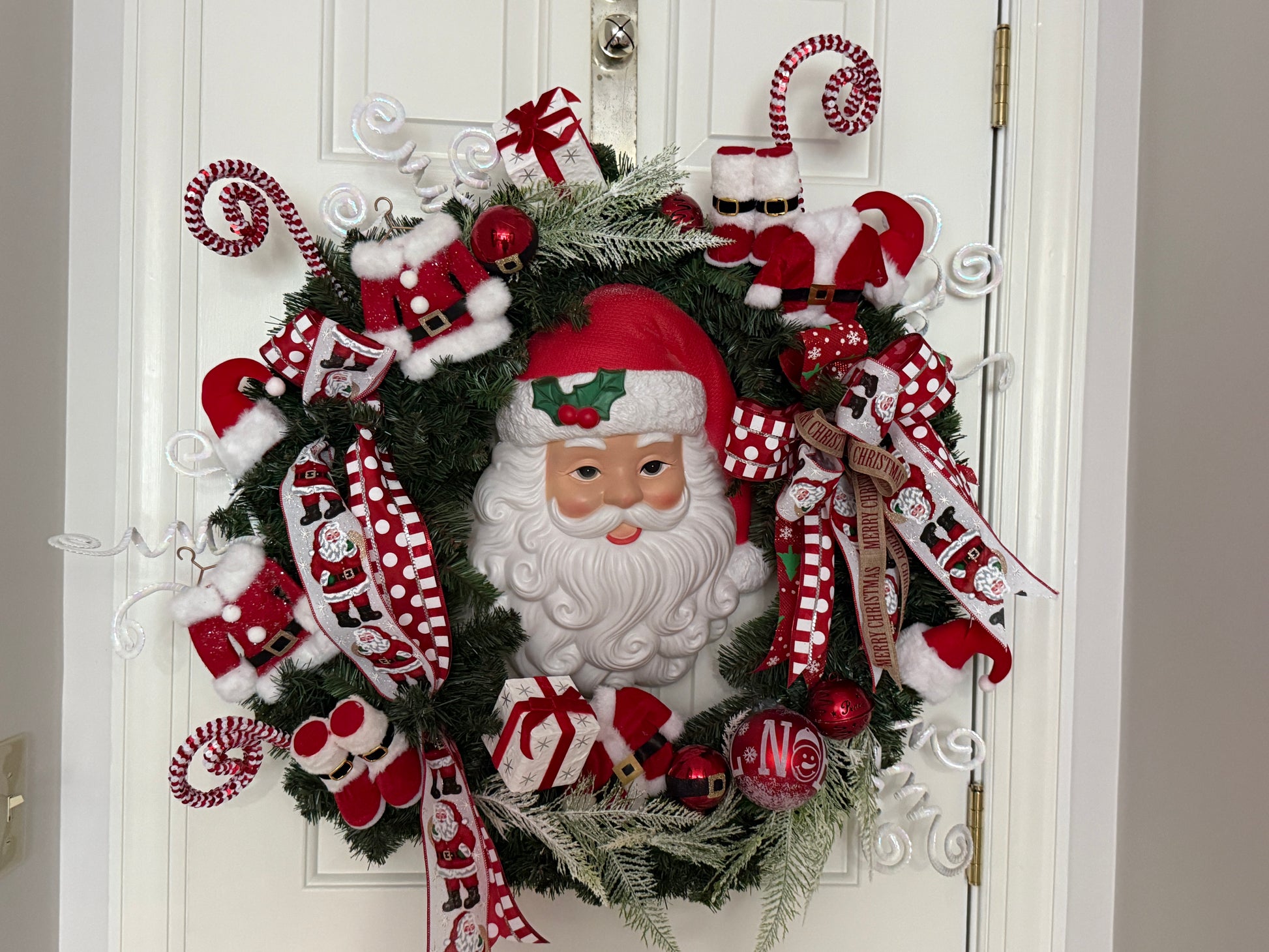 Light-Up Santa Face Wreath – Vintage Christmas Charm with Candy Cane Accents | Madison on Main | One of a Kind